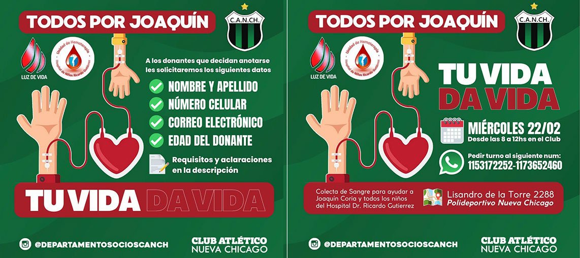 El Departamento de Socios y Socias del Club Atlético Nueva Chicago organizará, junto a la agrupación Luz de vida, una jornada solidaria el miércoles 22 de febrero entre las 8 y las 12 en el auditorio del Polideportivo ubicado en Lisandro de la Torre 2288, en el barrio de Mataderos, Comuna 9.